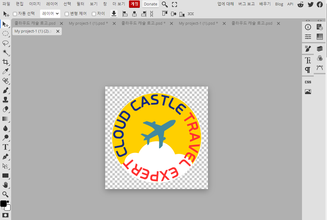 지인 회사는 여행사인데, 회사명(CLOUD CASTLE)과 여행 전문가(TRABLE EXPERT)를 로고의 외곽에 둘러서 영문으로 써 봤습니다. 그냥 동그란 이미지를 보니 왠지 둘러서 글씨를 쓰고 싶다는 생각이 나서 아무 생각 없이 해봤는데 괜찮더군요.