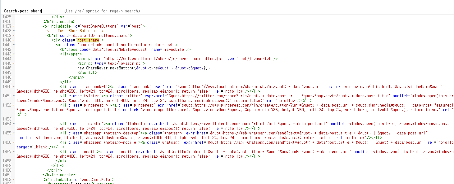 구글 블로그는 템플릿마다 약간의 차이는 있을 것 같습니다. 저의 경우 아래와 같이 post-share 항목에 공유 링크가 붙어 있습니다. 그리고 해당 행목은 <li> 리스트로 되어있습니다.