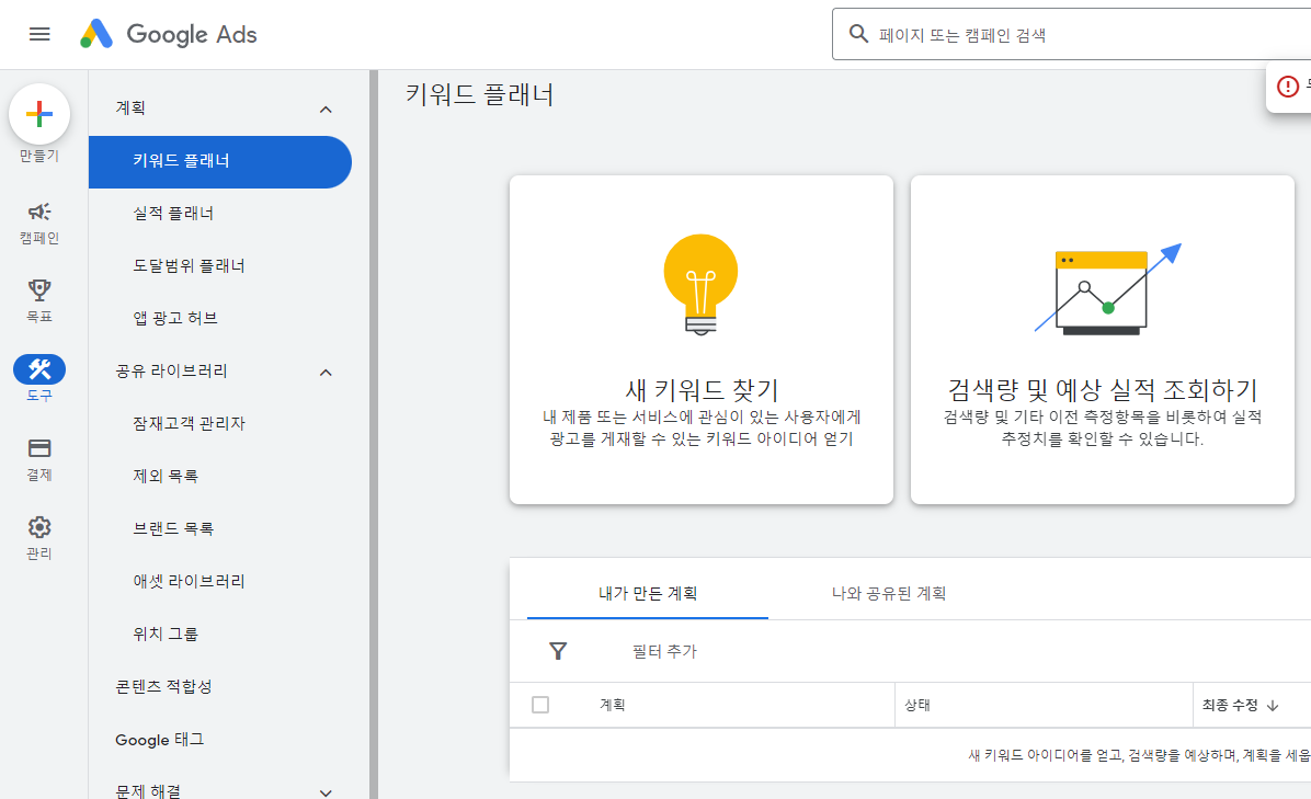 먼저 Google Ads를 누르시고 캠페인 및 도구에서 우측 도구 밑에 키워드 플래너를 눌러주세요