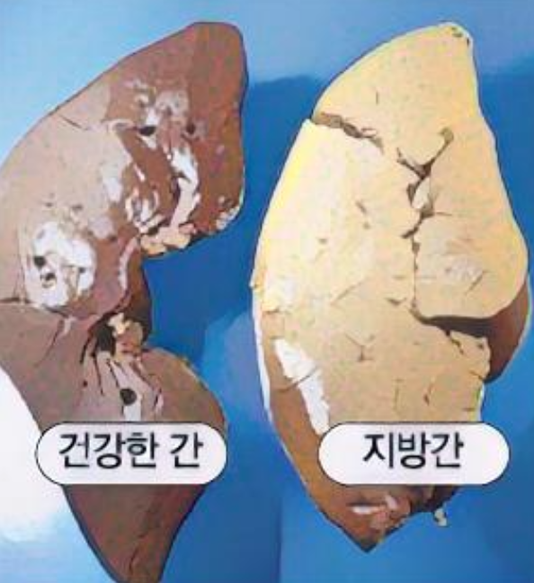 지방간 환자를 보면 아래 이미지와 같이 초콜릿 색깔이 아니라 간에 노랗게 지방이 끼어있게 됩니다.