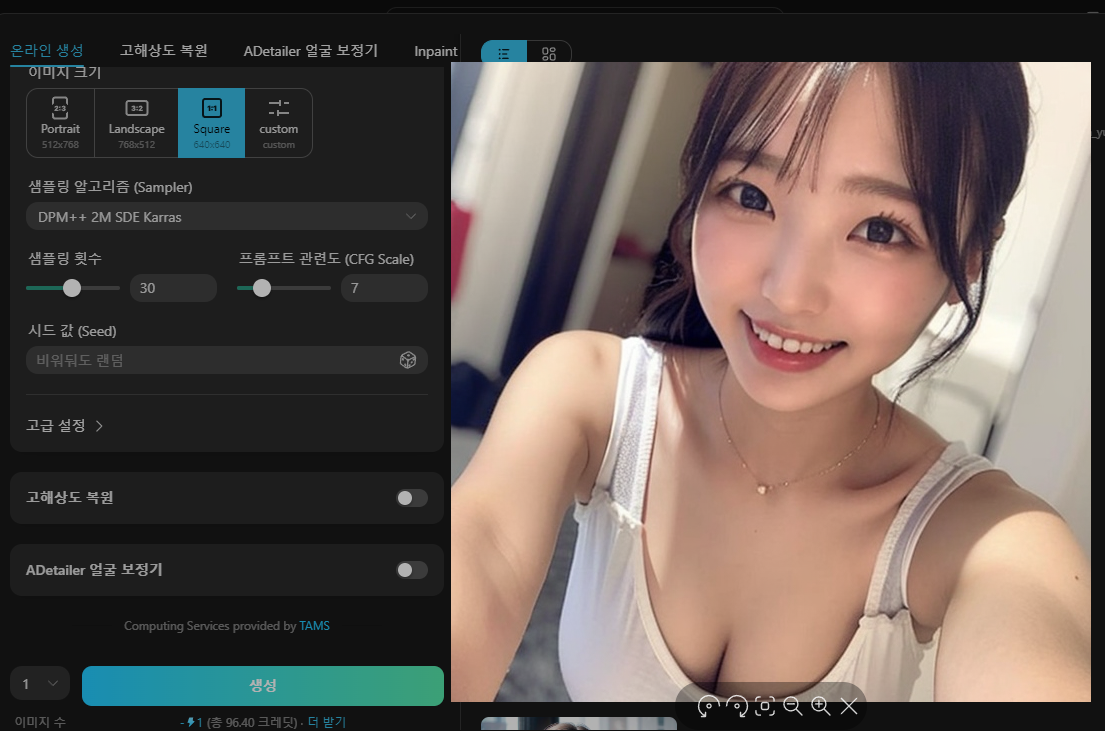 만약 이미지 품질이 더 중요하다면 DPM++ SDE Karras를 사용해 보시는 것도 좋습니다.