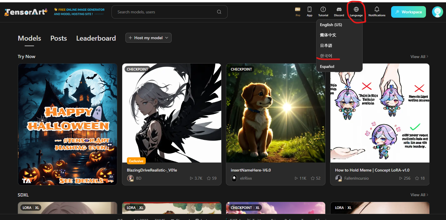 그리고, 만약 웹페이지가 영문으로 바뀌면 Tensor Art의 첫 페이지에서 우측 상단에 Language를 눌러서 한글로 바꿔주실 수 있습니다.