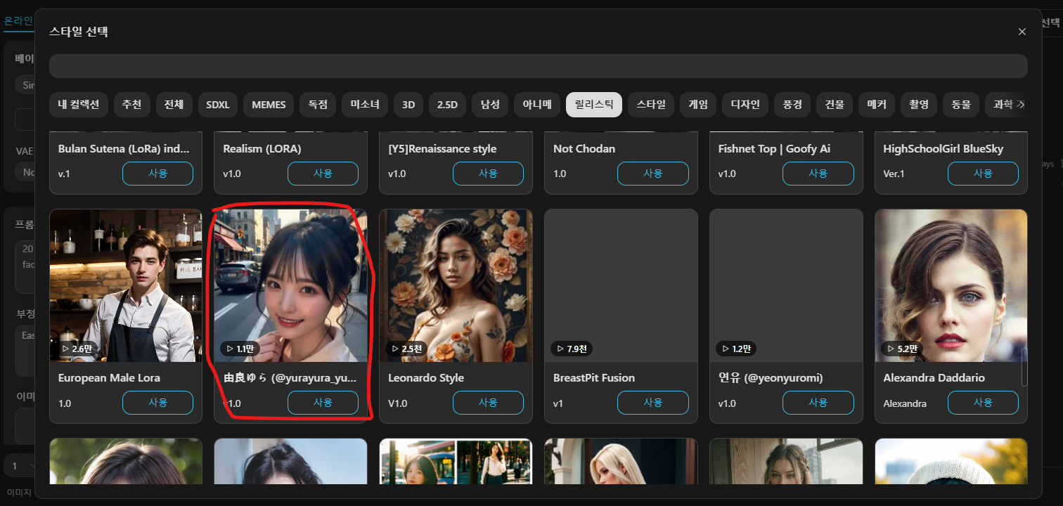 지금까지 간단하게 이미지를 생성해 보았습니다. 그런데, 여기서 디테일이나 스타일을 더 추가하고 싶다면 "Lora 추가"를 눌러서 추가해 줄 수 있습니다. 로라 추가를 누르면 화면이 나타나는데, 역시 "릴리스틱"을 누르고 아래에 나오는 이미지들 중에 내가 의도하고자 하는 이미지와 비슷한 이미지를 선택합니다.
