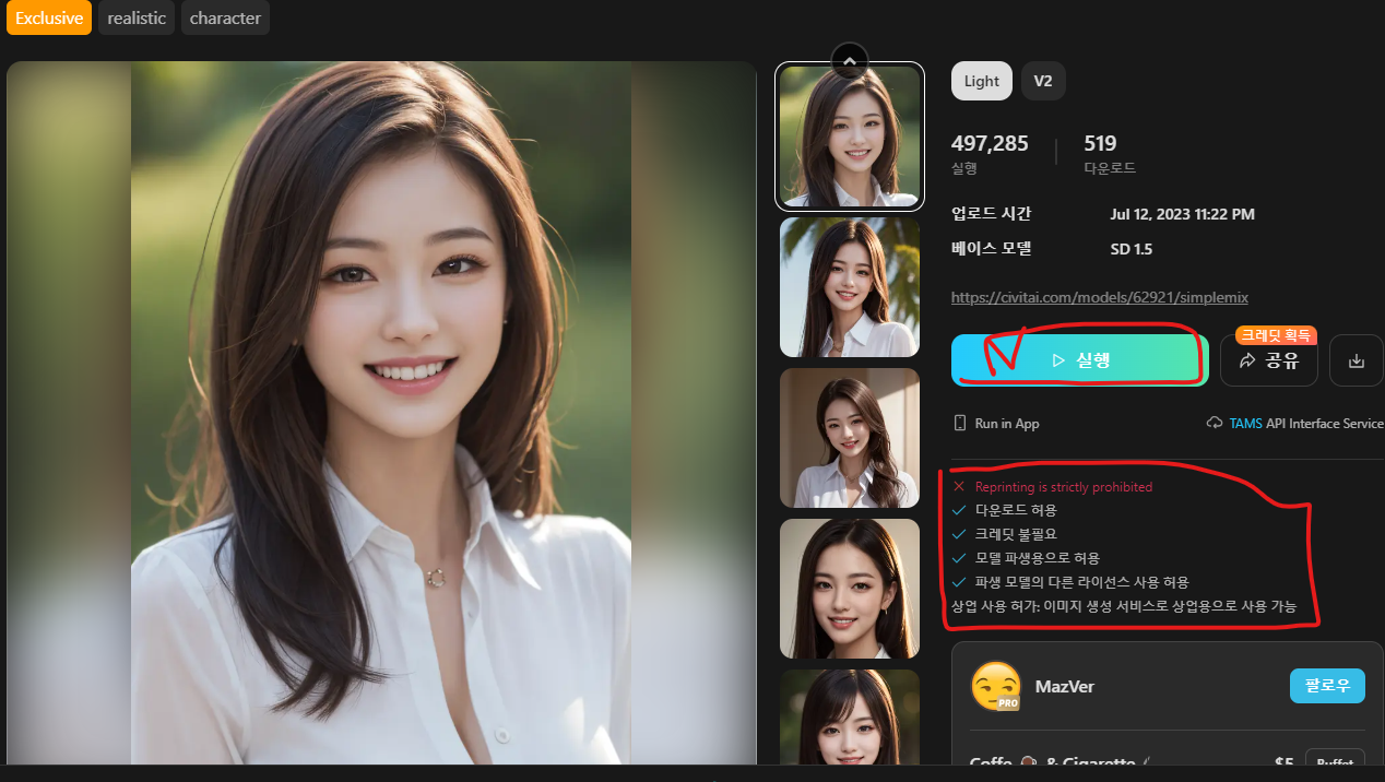이 중에 가장 우측에 있는 차분한 여성분 사진을 선택했습니다. 아래와 같은 화면이 나타나는데, 저작권에 대해서 다운로드 허용, 크레딧 불필요, 모델 파생용으로 허용, 파생 모델의 다른 라이센스 사용 허용 등이 표시되어 있고, 상업 사용 허가: 이미지 생성 서비스로 상업적으로 사용 가능하다고 나와있어서 편리하게 이미지를 생성하시고 필요한 곳에 사용하실 수 있습니다.