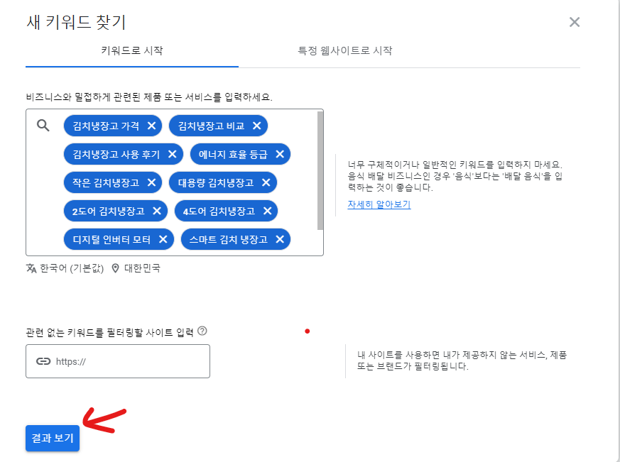 이제 구글 애즈의 키워드 플래너로 들어가서 새 키워드 찾기로 들어갑니다. 저는 오늘 김치 냉장고에 대해서 포스팅을 해보려고 합니다.