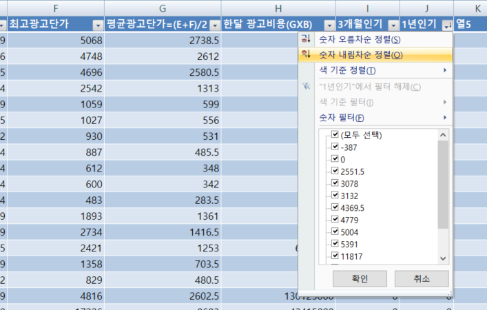 다음으로 1년 인기 칼럼을 같은 방식으로 만듭니다. D 칼럼의 전년대비 상승과 평균광고단가인 G 칼럼을 곱해서 1년 인기 칼럼을 4번째로 만듭니다.
