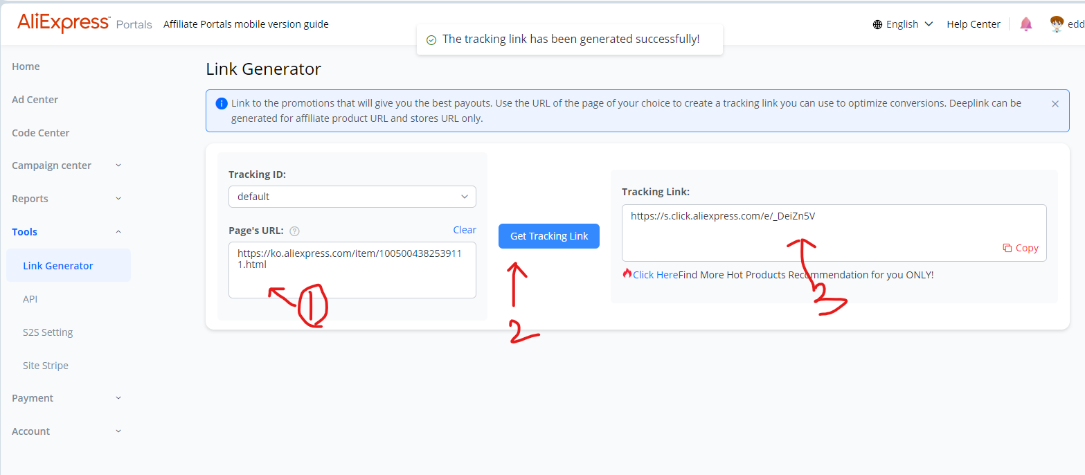 그 후에 위에 보이시는 것 처럼 1번에 상품 주소를 넣고 2번 "Get Traking Link"를 누르면 우측에 Traking Link에 내가 판매에 사용할 링크가 나타납니다.