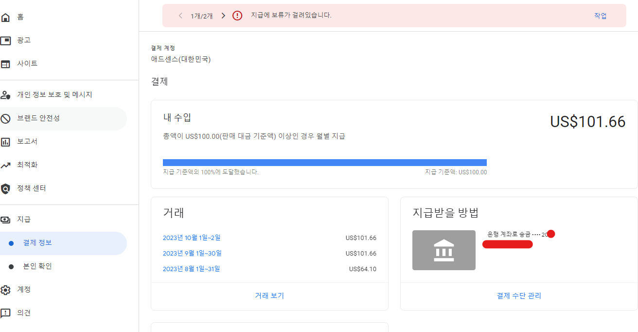 이로써 구글 애드센스에 결제 정보 입력이 완료되었습니다. 지급 보류에 대한 경고 메시지는 바로 사라지지 않으나 며칠 뒤에 사라질 것입니다.