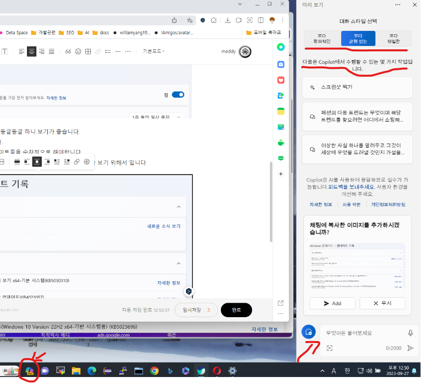 아래 화면과 같이 작업표시줄에 코파일럿 아이콘이 생겼으며, 이를 누르면 우측 화면에 엣지의 빙챗에서 보던 것과 유사한 형태의 창이 나타나고 해당 창에서 gpt 4를 이용하실 수 있습니다.