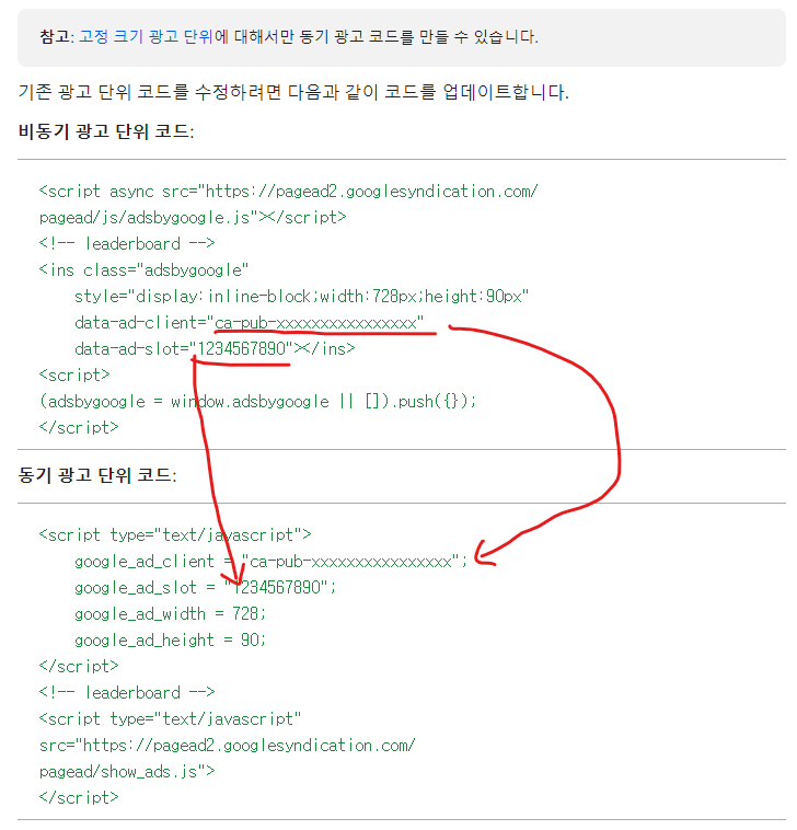 아래의 애드센스 비동기 광고 코드와 동기 광고 코드, 그리고 위의 그림 설명을 참고하셔서 코드를 변경하시면 됩니다. 아래 애드센스 코드는 복사용으로 추가하였습니다.