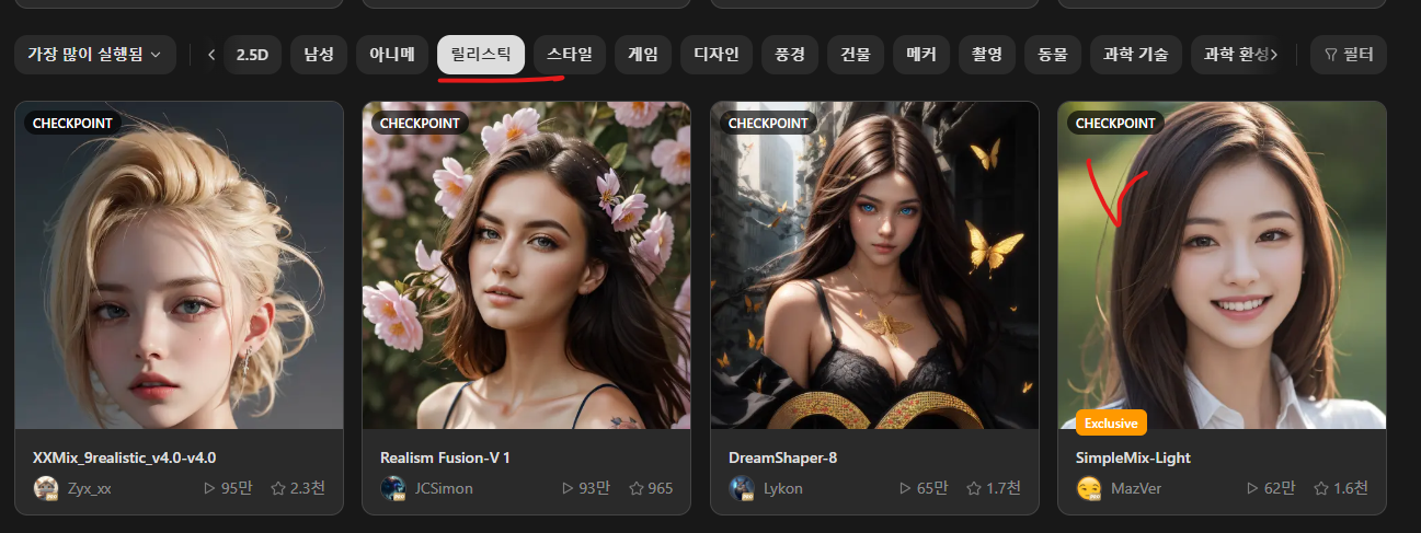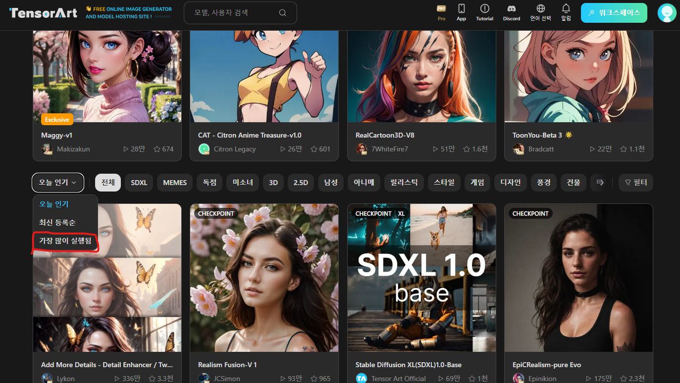 이제 모델 페이지에서 아래로 내리다 보면 "오늘인기"라는 부분이 나오는데 여기서 가장 많이 실행됨을 눌러서 사람들이 많이 실행한 체크포인트를 선택합니다.