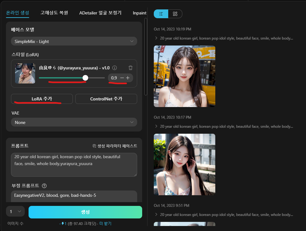 Lora는 여러 번 추가하셔서 스타일이나 이미지에 느낌을 변경시키실 수 있습니다.