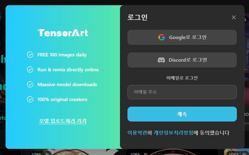 처음 접속하시면 아래의 화면이 나타나는데 구글로 로그인을 누르시면 구글계정으로 바로 로그인이 됩니다. TensorArt에는 매일 100개의 이미지를 무료로 생성할 수 있다고 소개하고 있습니다. 그리고 다양한 모델을 통해 내가 원하는 이미지를 생성할 수 있습니다.