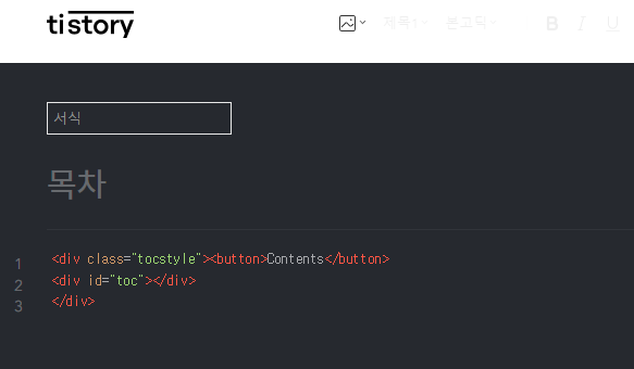 티스토리 블로그에 목차를 넣는 방법은 이전 포스팅에서 구글 블로그에 목차를 넣은것과 동일하게 진행합니다.