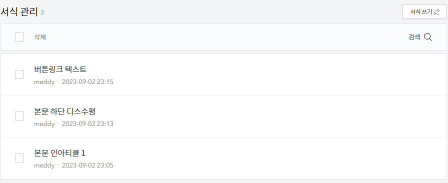아래 화면에서 보시는 것 처럼 "서식 관리" > "서식 쓰기"를 눌러서 서식 글쓰기 화면으로 이동합니다.